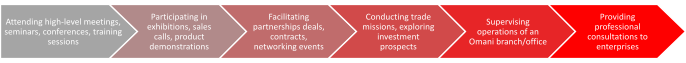 Additionally, the formal invitation letter from the sponsoring entity in Oman must clarify details like – the nature of planned business dealings, names of parties involved, and durations and locations of meetings, events, or trade conferences to attend.