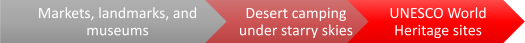 Experience the rich history, culture, landmarks, desert camping, beaches, and natural beauty for leisure travel, from a tourist’s pov. Activities include: