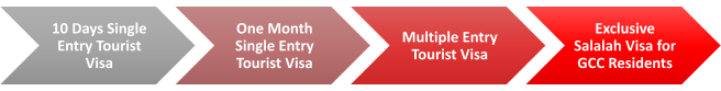A1: The tourist visas are: 10 Days Single Visit, 30 Days Single Entry, Multi-Entry, and 28 Days Visa for GCC Residents.